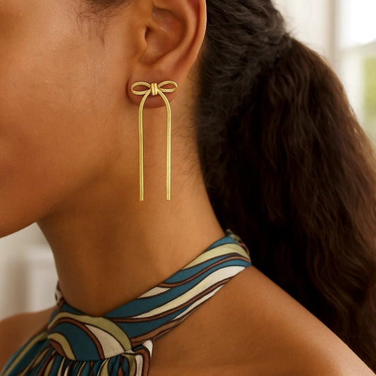 Sterling Silver Yellow Gold Plated Snake Chain Drop Dangle Bow Earrings