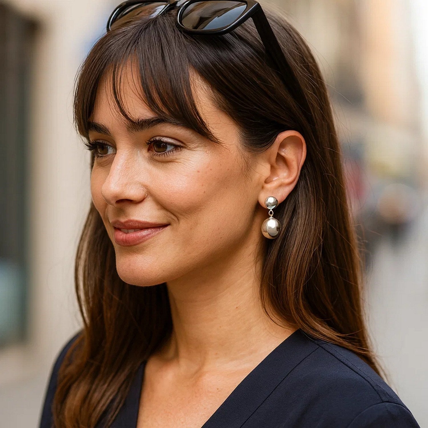 Elegant sterling silver rhodium plated puffed round double button drop earrings featuring a smooth, polished finish and a gracefully layered design. The puffed round shapes add volume and shine, while the rhodium plating enhances brilliance and durability for timeless appeal.